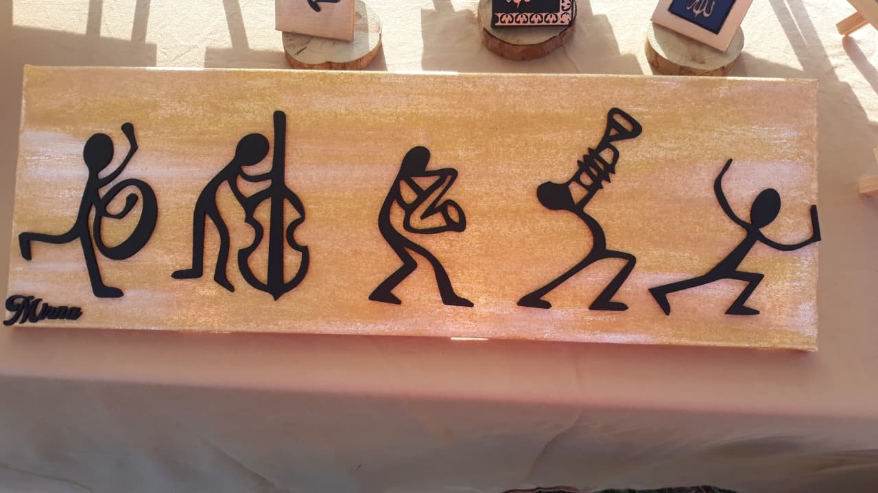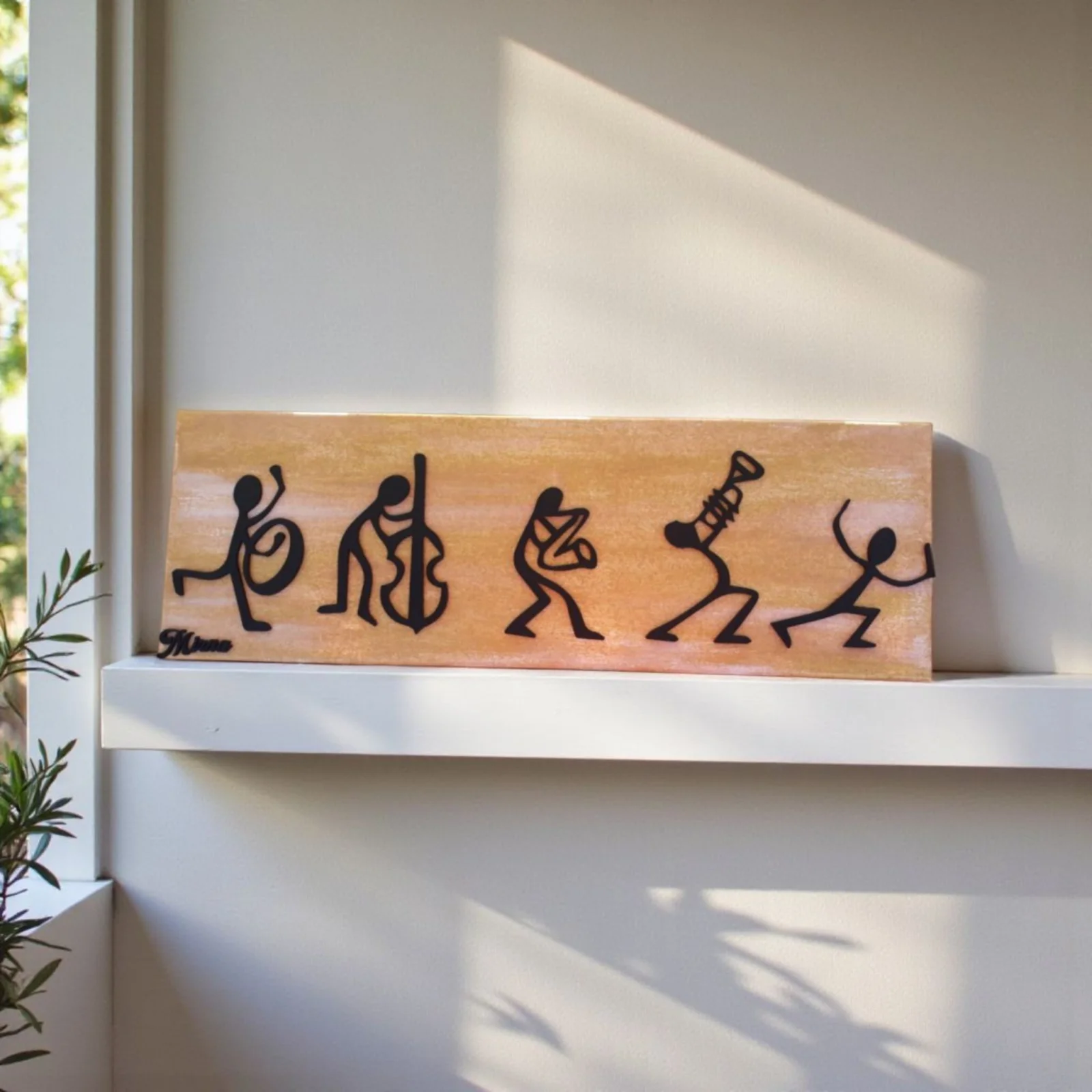 Design: portrays abstract musician figures crafted with mosaic texture and hand-painted details to express rhythm and movement